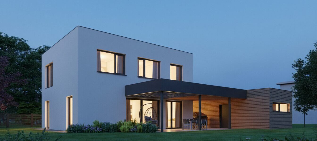 Konstrukčně dům zůstává věrný osvědčeným stavebním materiálům – zděné stěny, systémové stropy, betonové schodiště, fasádní omítka v čistém bílém odstínu. V kontrastu k domu je navržena dílna s přístřeškem s dřevěným obložením a navazující pergola lemovaná černým rámem. Zelená střecha neodmyslitelně znásobuje podíl zeleně i při pohledu z horních pokojů. Přístavba je navržena jako samostatný objekt a je tedy možné realizovat ji beze spěchu, dle chuti a prostředků.